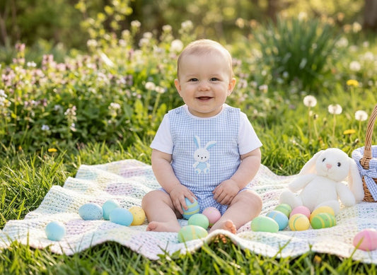 Light Blue Gingham Easter Bunny Applique Shortalls