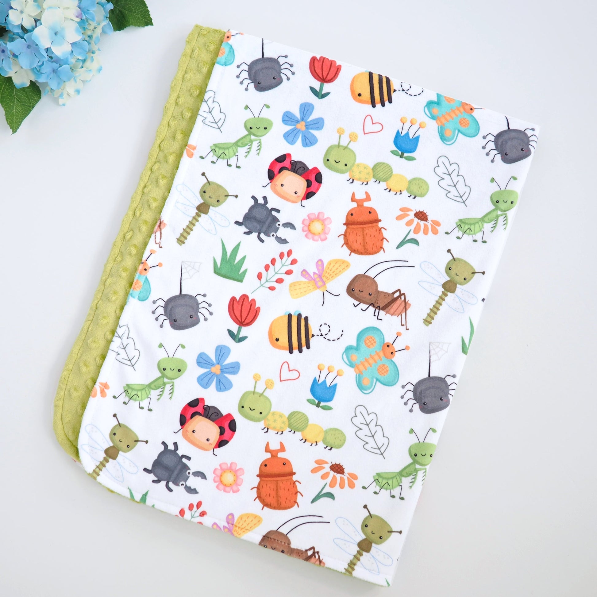 This cute bugs pattern is our own unique print and the blanket is made with premium quality minky fabric to provide only the softest touch for your baby. The back side minky texture makes the blanket more fun and offers sensory stimulation for babies. With the dimension of 30x40 inches, this blanket is great for newborn to toddler age. It's also lightweight and perfect for car ride, stroller, or nap time. With its premium quality, this blanket is made to last for years.
