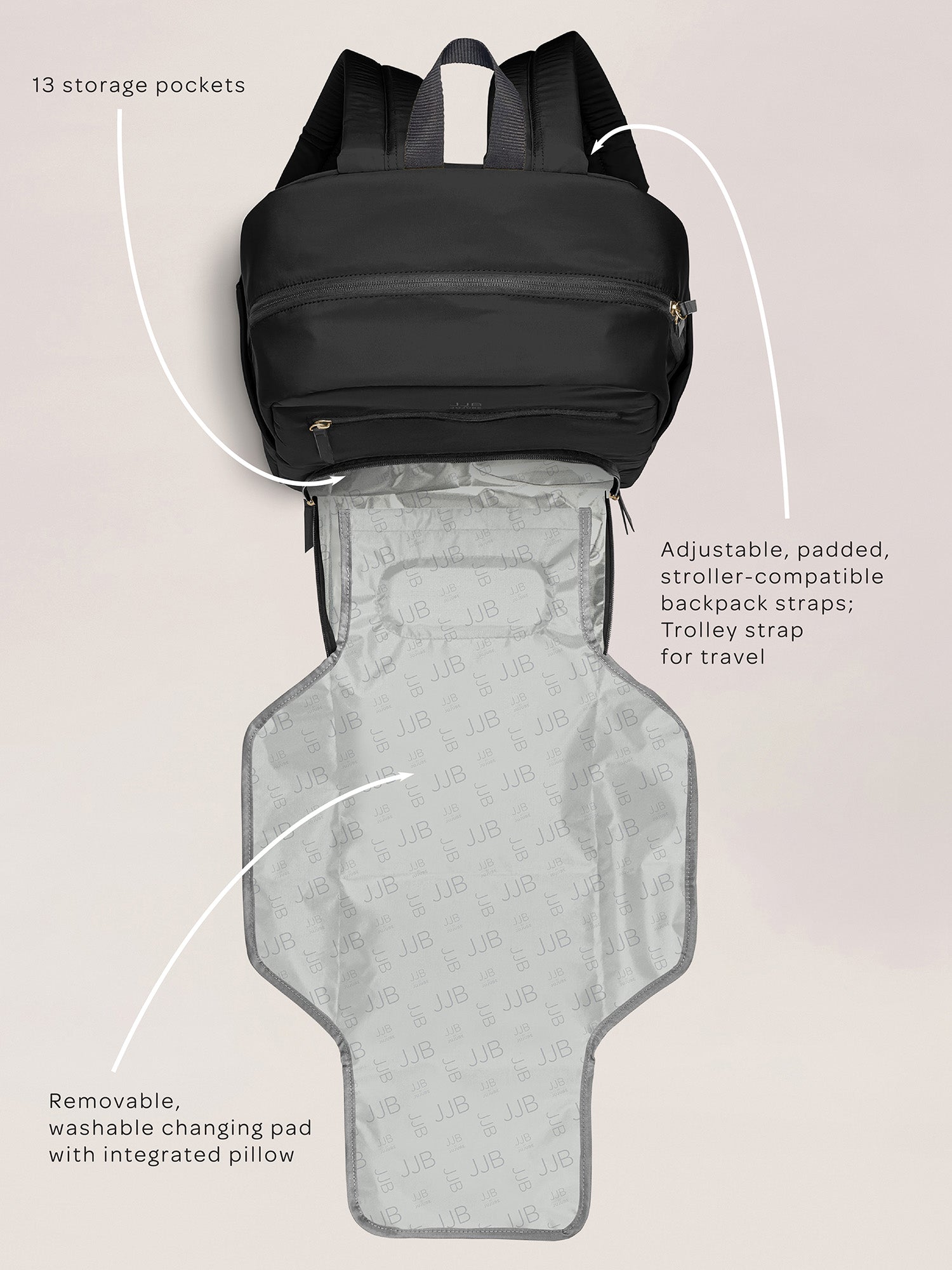 Parent life just got easier with the Deluxe Backpack from JJB by JuJuBe. This backpack’s front-pocket changing station stores diapers and wipes and includes a washable changing pad with integrated pillow—everything you need to make diaper changing quick and easy wherever you are. Feeding is simple with the insulated bottle pocket that holds any sized bottle, and additional storage compartments keep everything in its place and easy to find. The Deluxe Backpack has padded, stroller-compatible backpack straps and a trolley strap so you can travel with the little ones in comfort. When you’re organized and prepared with a backpack full of solutions, you can enjoy your time out with the kids that much more!