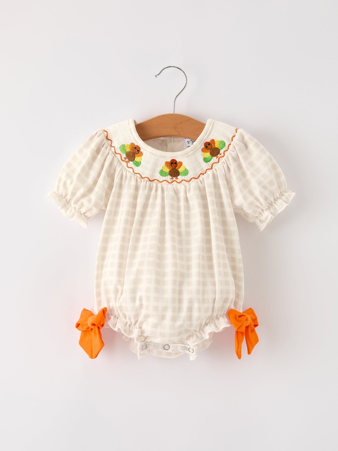 Celebrate the season in style with this adorable baby girls romper featuring apricot plaid fabric and charming turkey embroidery. The delicate smocking adds a classic touch, making it perfect for Thanksgiving gatherings. Soft and comfortable, this romper keeps your little one cozy while looking festive and cute. Ideal for capturing memorable holiday photos and creating lasting family moments.