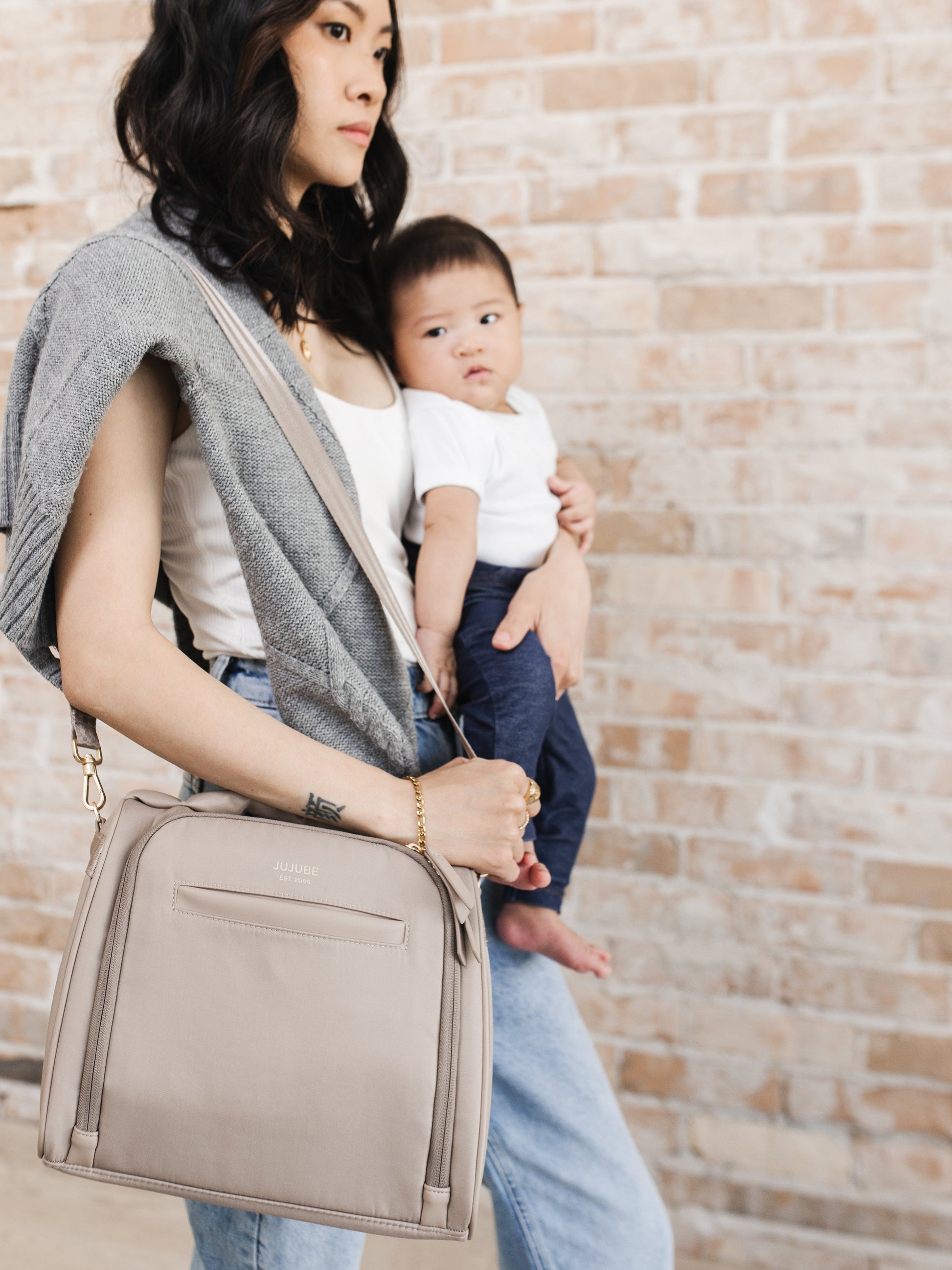 Keep your cool with the stylish Insulated Bottle Bag from JuJuBe. For easy use, this bag has an outside slip pocket, interior mesh pockets, and an elastic bottle strap, as well as a quick-grab top handle and an adjustable, detachable messenger strap. Doubling as a lunch bag, the bottle bag features food-safe, easy-to-clean PEVA lining, and accommodates up to three tall bottles with additional space for food to keep your little one’s favorite snacks and drinks cool while you’re out and about. Parent life is full of food messes, and the Insulated Bottle Bag is easy to clean. Simply toss it in the washing machine!